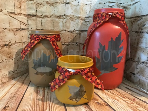 Set Of Fall Leaves Painted Mason Jar Tea Light Candle Holders Painted Mason Jar Mason Jar Tea Light Candle Holder Fall Decor