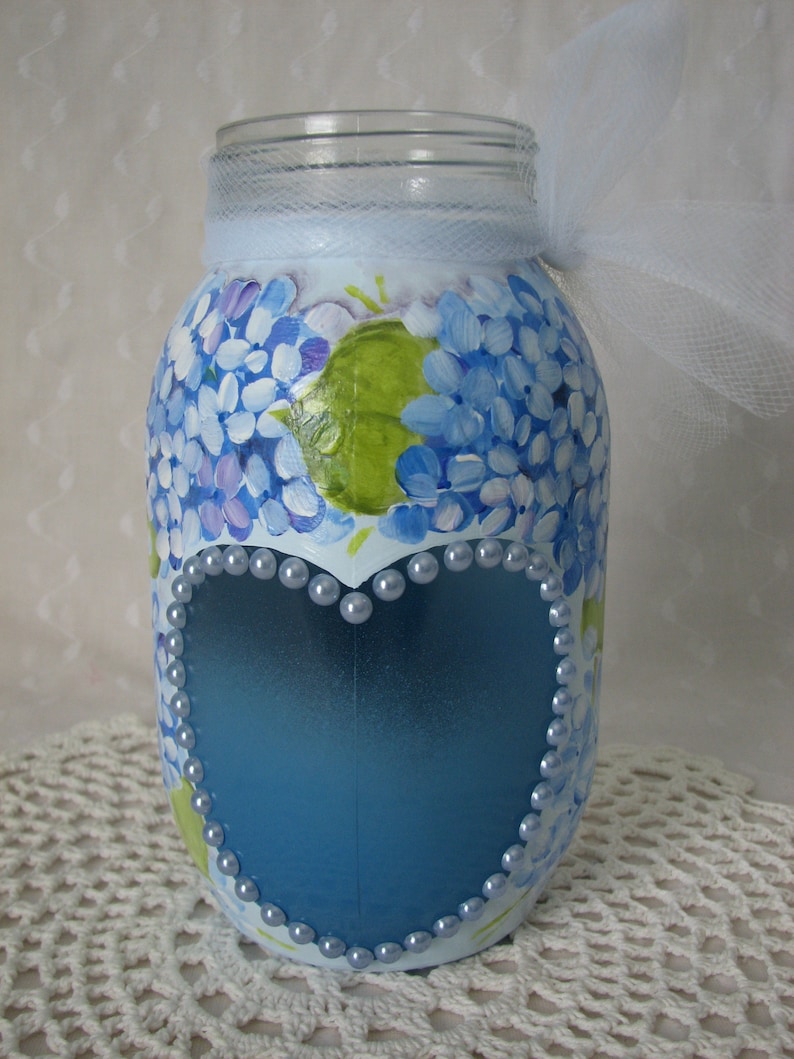Glass Jar Heart Hand Painted Blue Hydrangeas Pearls Candle Holder Flower Pot Bath Kitchen Storage